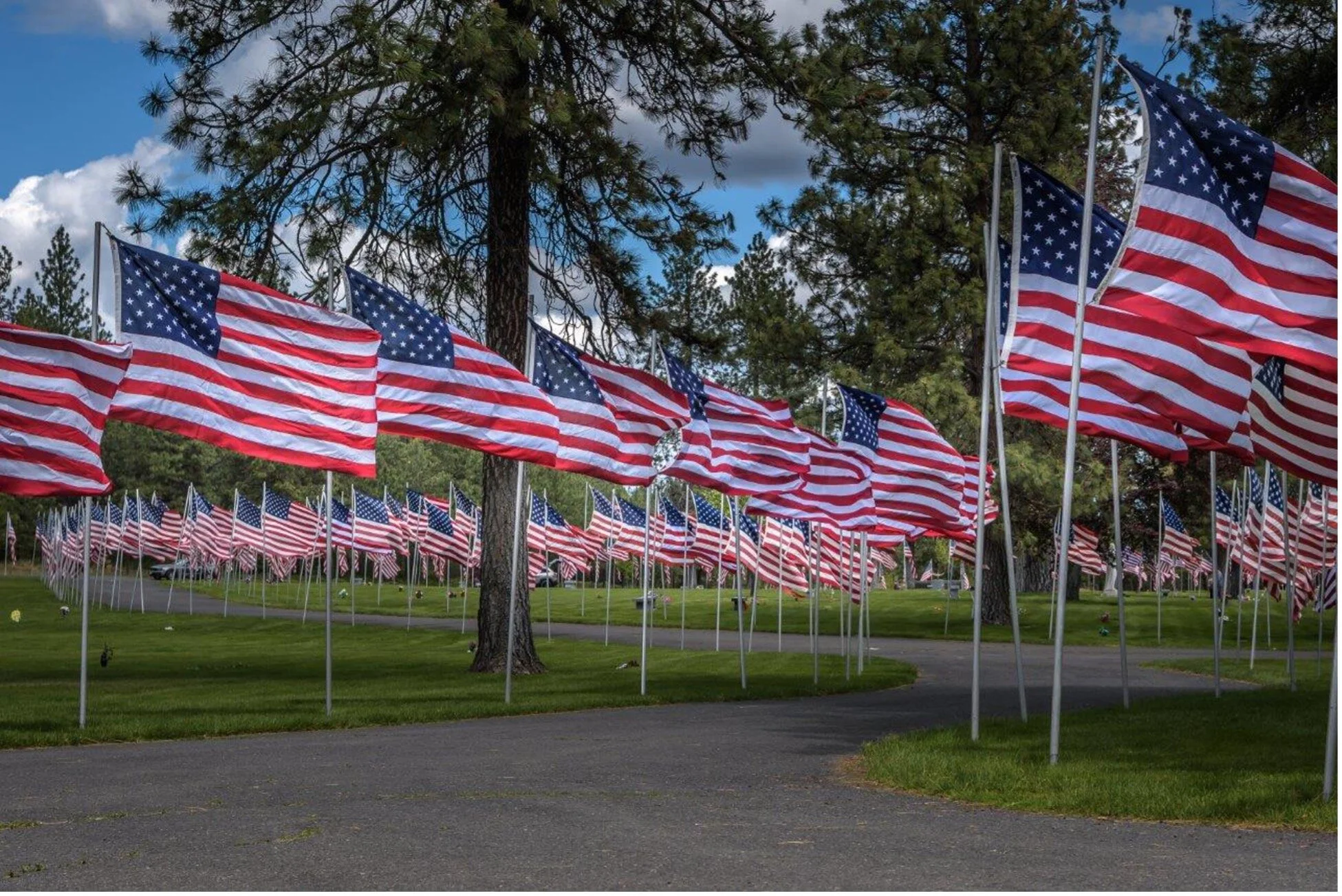 My parents are buried at Greenwood Memorial Cemetery in Spokane, Washington. Each Memorial Day weekend, over 2000 flags are raised at the cemetery. It is quite the site to behold.
